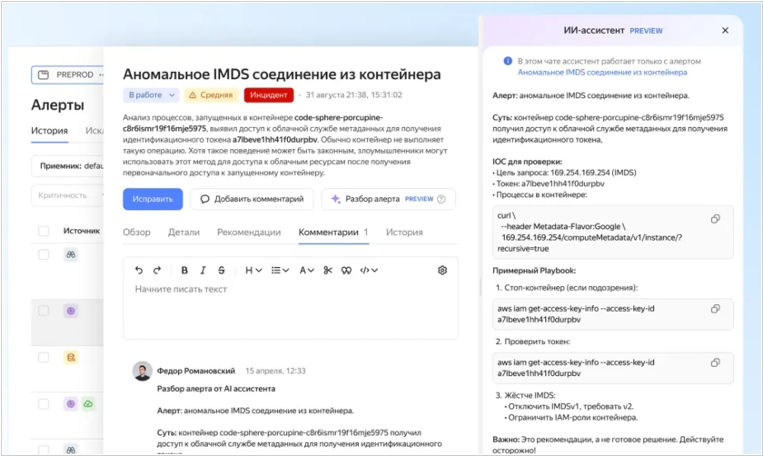 В консоли управления Yandex Cloud появился ИИ-чатбот, который помогает настраивать облачную инфраструктуру, администрировать базы данных, анализировать отчеты и выполнять другие задачи, предупреждает об инцидентах информационной безопасности. Для этого достаточно отправить запрос ассистенту в чат простыми словами. Он поймет даже общие запросы – например, «помоги собрать инфраструктуру для онлайн-магазина». Нейросеть подберет нужные параметры, и если пользователь согласится с ее расчетами, она сама развернет и настроит необходимую инфраструктуру (т.е. он работает и как ИИ-агент). Клиент также может внести корректировки и запустить ресурсы самостоятельно – в таком случае ассистент составит подробную инструкцию. Он также может проанализировать оповещения систем безопасности и дать дополнительные рекомендации, как повысить уровень защиты своей инфраструктуры. В случае инцидента нейросеть поможет понять, насколько он критичен, и что нужно делать.