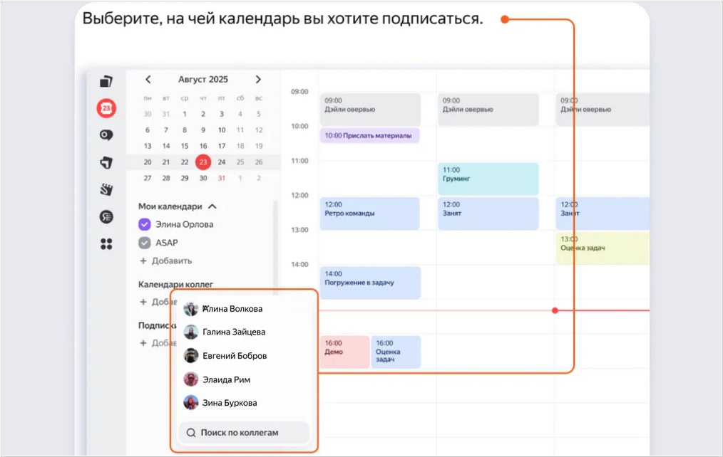 В Яндекс.Календаре появилась возможность подписываться на календари коллег. Вы можете включать календари других сотрудников в основной сетке или просматривать мероприятия в календарях коллег в отдельной вкладке. Функция сокращает этапы согласований и позволяет быстрее планировать встречи. Коллеги также могут просматривать ваше расписание, если подпишутся на него. Полностью закрыть свой календарь от подписок нельзя, но можно сделать приватными отдельные встречи. Для этого настройте видимость в конкретном мероприятии или задайте соответствующие параметры в настройках слоя.