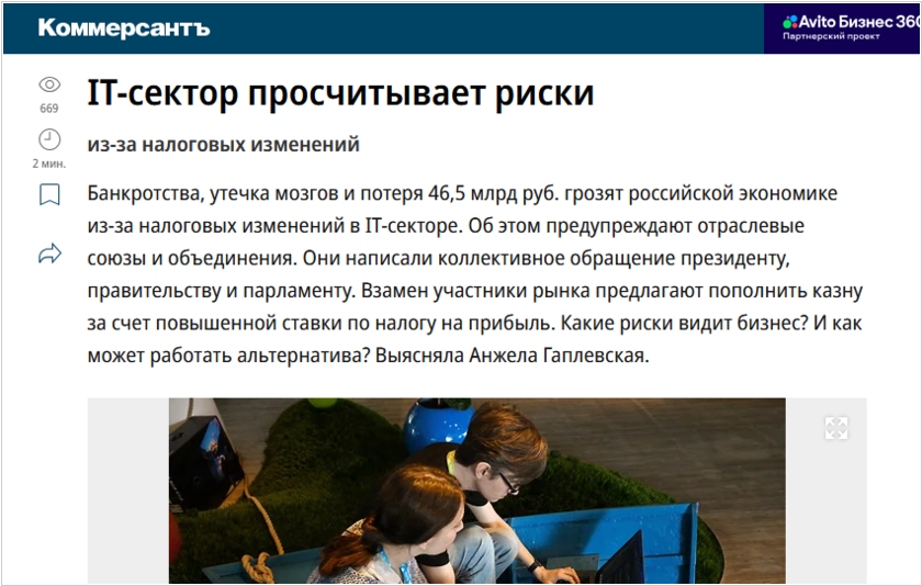 Отраслевые союзы и объединения России написали коллективное обращение президенту, правительству и парламенту из-за предстоящих налоговых изменений (отмены нулевой ставки НДС, двукратное повышение льготных тарифов страховых взносов и сокращения лимитов по годовой выручке для УНС в шесть раз). Говорят, вместо ожидаемого повышения сборов, это приведет к потере 46,5 млрд руб, а еще - банкротству многих маленьких ИТ компаний, и оттоку специалистов за рубеж и в крупные компании. А, как следствие, у нас произойдет огосударствление сектора, что приведет к потере качества и прогресса. Вместо повышения налогов на малый бизнес участники рынка предлагают пополнить казну за счет повышенной ставки по налогу на прибыль.