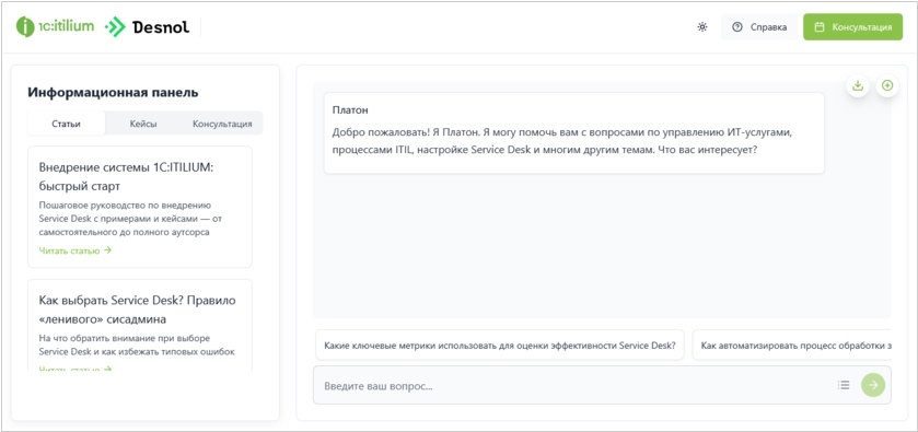Компания Деснол, разработчик ITSM/ESM-решения 1С:ITILIUM, запустила онлайн ИИ-консультанта по имени Платон, который специализируется на настройке Service Desk и ITSM-решений. Разработчики утверждают, что он не просто дает шаблонные ответы, а персональные рекомендации: готовые пошаговые планы, расчет стоимости внедрения и владения продуктом, варианты решений задач, адаптированные под специфику конкретного запроса. В этом помогла библиотека знаний и опыт команды Деснола, основанный на десятках реализованных проектов внедрений. Среди наиболее популярных запросов: как автоматизировать процесс обработки заявок в ИТ-отделе или организовать учет и инвентаризацию ИТ-оборудования, какие ключевые метрики использовать для оценки Service Desk, как настроить соглашение об уровне сервиса (SLA). Платон доступен бесплатно, и теоретически может давать советы по внедрению любой системы, но конечно будет убеждать вас купить ITILIUM.