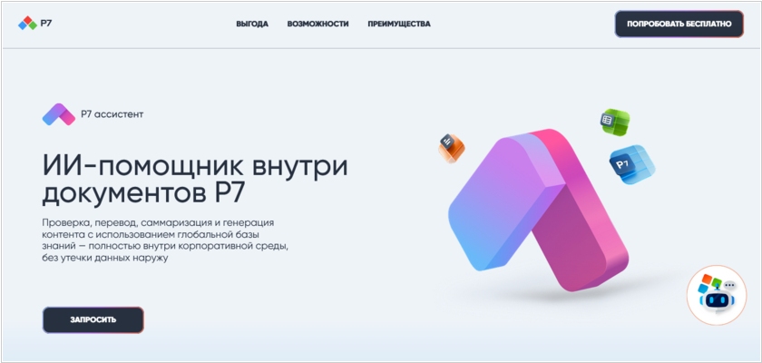 В офином пакете Р7-Офис появился Р7-Ассистент - ИИ-чатбот, который интегрирован в редакторы документов и предоставляет возможности для работы с текстом: генерация, корректура, выделение ключевых мыслей, качественный перевод на различные языки и многое другое. Для своей работы «Р7-Ассистент» требует развертывания серверной части на вычислительных мощностях заказчика - а значит обеспечивает безопасность данных без их передачи во внешние сервисы. Решение может масштабироваться для крупных предприятий и отличается гибкостью – можно выбрать между различными ИИ-моделями. Также, перспективной опцией является возможность тонкой настройки ИИ-модели (fine-tuning) под конкретные запросы клиента. Решение предоставляет встроенные функции для разграничения прав доступа и аудита использования.