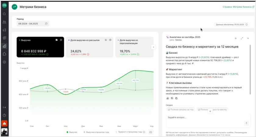 Вышло обновление системы управления маркетингом Mindbox. В нем появился AI ассистент. Он живет в отчете «Метрики бизнеса» и помогает находить гипотезы для роста бизнеса. Он анализирует более 20 показателей бизнеса, рассылок и сценариев и генерит идеи механик по запросу. Например, подскажет, почему выручка снизилась, что на это повлияло и как исправить ситуацию. Также, в отчете «Метрики бизнеса» появилась возможность настраивать цели - можно задать до 4 метрик и результат, который планируете достичь. Показатель попадет в дашборд, чтобы удобнее отслеживать прогресс. А еще, в конструкторе email-рассылок можно без кода создать кастомную страницу отписки: добавить выбор тематик, ссылки на соцсети и мессенджеры. Таким образом, можно сохранять клиентов, которые хотят отписаться от email-рассылок.