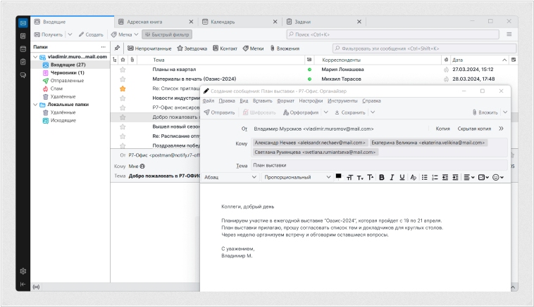 Приложение для управления почтой, контактами и деловым расписанием на основе Thunderbird. Входит в состав платного офисного пакета Р7-Офис.