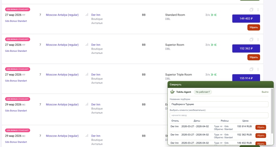 Веб сервис для турагентств. Позволяет создавать индивидуальные настраиваемые подборки туров, вести базу клиентов, создавать задачи и напоминания ручные и автоматические. Вести статистику и учет продаж и проставлять метрики и KPI сотрудникам. Позволяет использовать настроенный шаблон для создания подборок и быстрое изменение и редактирование уже созданный подборок с сохранением единой ссылки на нее для клиента.