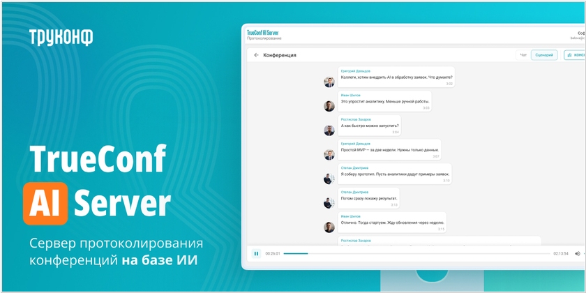 Компания Труконф представила новый продукт - TrueConf AI Server, который умеет автоматически фиксировать все детали обсуждений во время онлайн-совещаний и многопользовательских видеоконференций, формируя подробные стенограммы с возможностью экспорта и ведения текстового архива. Он работает локально в паре с TrueConf Server. После онлайн встречи список доступных пользователю стенограмм отображается в соответствующем разделе в личном кабинете, в клиентских приложениях TrueConf или в кабинете пользователя сервера протоколирования TrueConf AI Server. Расшифрованные конференции можно Открыть, а нерасшифрованные — отправить на расшифровку. Итоговую расшифровку можно отобразить в виде чата или сценария, а также воспроизвести аудиофрагмент выбранной реплики или аудиозапись всей конференции.